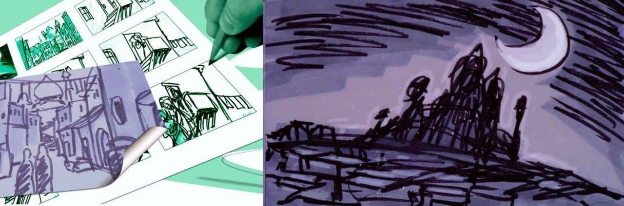 Utiliza el ejemplo de las Las mil y una noches de Arabia como ejemplo a lo largo del libro para ejemplarizar las técnicas de storyboard a base de bocetos. Un libro fundamental para todos aquellos artistas que quieran aprender a saber cómo contar las historias y mantener al espectador con interés constante. El contenido esta dividido en dos partes.